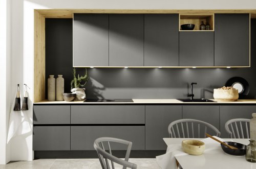 В линейке продукции Nolte Kuchen есть модель кухонной мебели Portland, которая привлекает к себе внимание фасадом, выполненным в соответствие с уникальной технологией. На его поверхность наносится цемент, который сверху покрывается матовым лаком. Он противостоит влаге и легко убирается при необходимости.