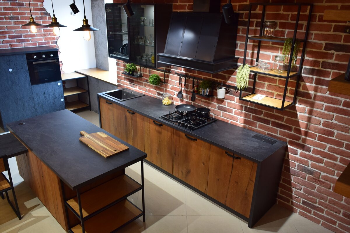 Для кухни в стиле лофт идеально подойдут столешницы из искусственного камня с текстурой под бетон или мрамор. Это придаст кухне современный и индустриальный вид. Такие столешницы могут быть выполнены в различных цветах – от классического серого до черного или белого. Для более яркого решения можно выбрать столешницу в цвете стали или бронзы.