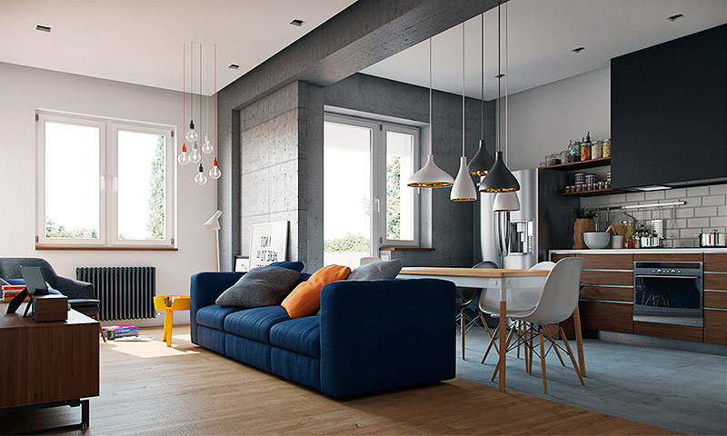 В условиях небольшой квартиры можно разместить мебель и технику, которая будет гармонично смотреться вместе и радовать своих владельцев практичностью. При этом каждый член семьи останется доволен проживанием в студии, да и не будет чувствовать дискомфорт. Отсутствие перегородок и стен не мешает правильно зонировать помещение. Сделать это можно с помощью разных вариантов половых покрытий, арок, колонн и разграничения на потолке.